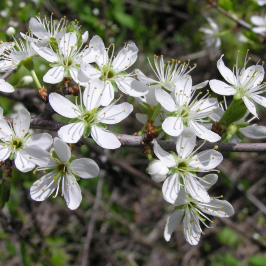 • Présentation : Arbuste. Floraison à la fin du mois de mars. Abondante source de nourriture pour Bourdons, Papillons, et nombreux autres butineurs. Derrière ses épines, de nombreux passereaux y nichent comme le Merle noir, les Fauvettes, les Grives ou l’Accenteur mouchet. Les petits mammifères comme le Hérisson s’y réfugient. Son feuillage nourrit nombre de chenilles de papillons comme le Flambé ou le Grand paon de nuit. Les prunelles nourrissent les oiseaux (et peuvent se consommer après les premières gelées).